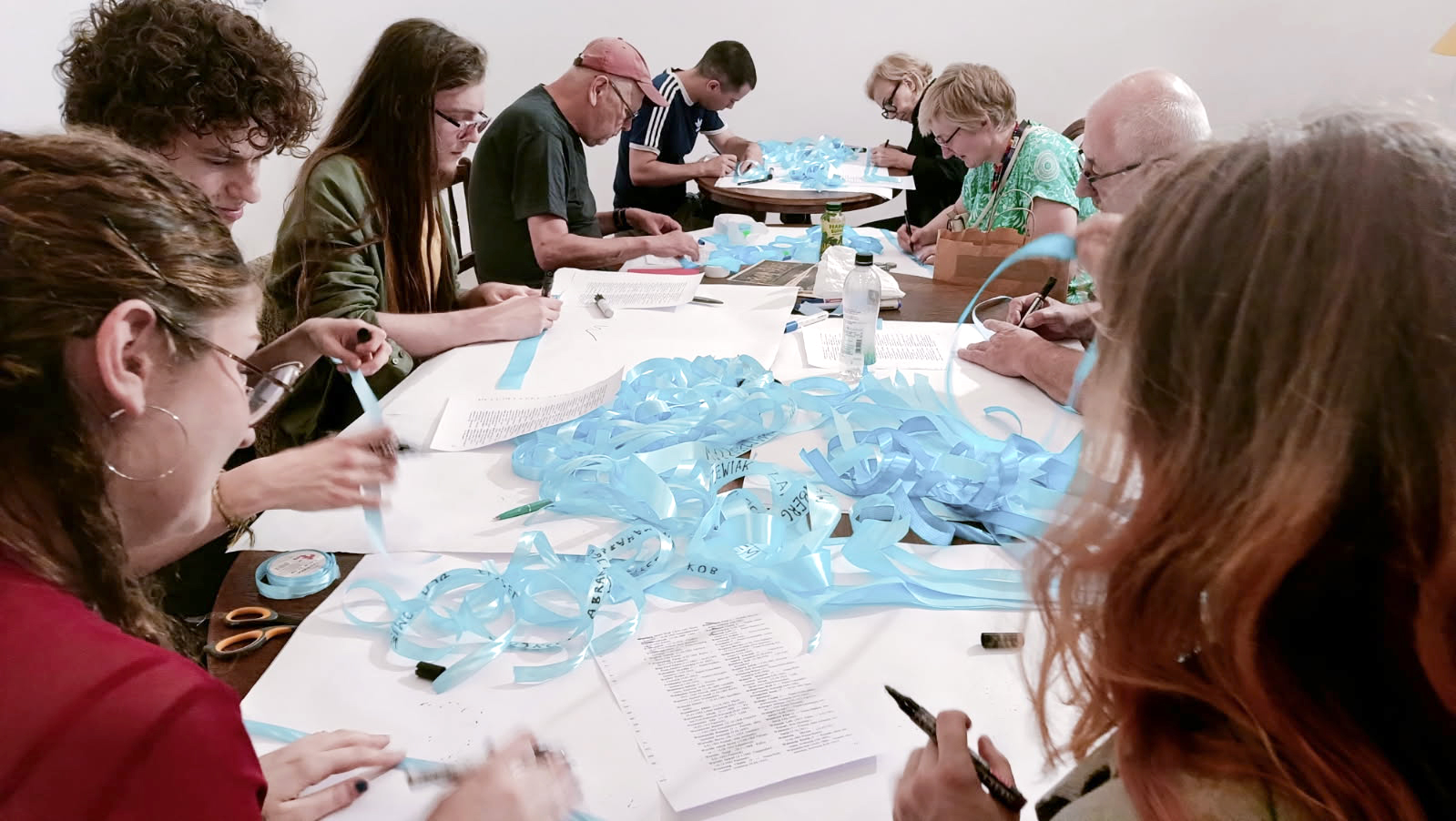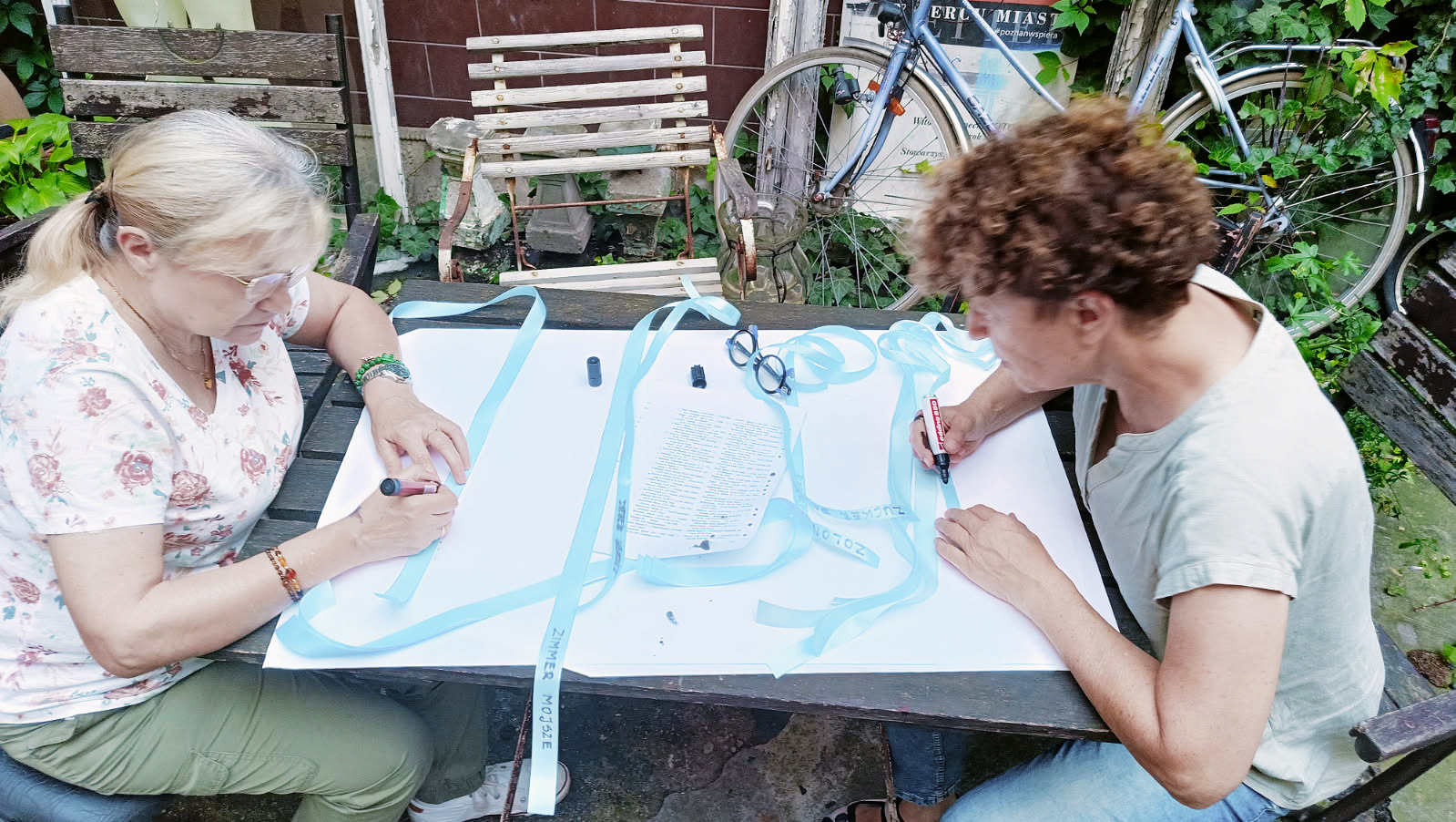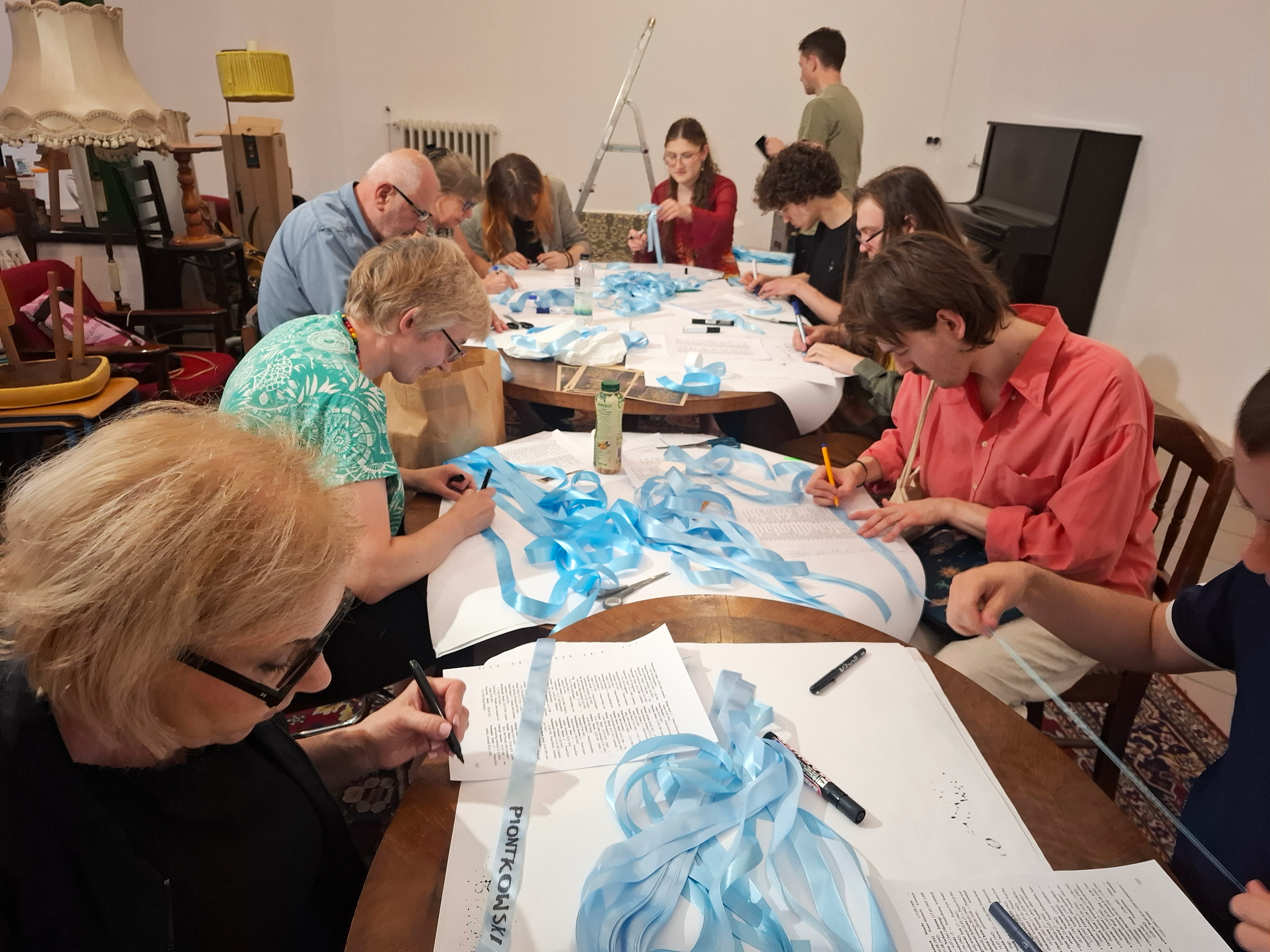 W poniedziałek, 1 września, spotkaliśmy się o godz. 18.00 w Atelier Wimar Stowarzyszenia Łazęga Poznańska w Poznaniu, by wspólnie przygotować wstążki, na których wypisaliśmy imiona i nazwiska żydowskich ofiar obozów pracy przymusowej w Poznaniu i okolicy. Niebieskie wstążki w piątek 6 września zawiesimy na jednej z bram wiodących na stadion. Zawiążemy je na supełek, pragnąc, by dusze zmarłych i zamordowanych związane była węzłem życia, by żyły w naszej pamięci. W ten sposób upamiętnimy więźniów obozów, których przywieziono do Poznania m.in. z gett we Włocławku, Chodczu, Lubrańcu, Izbicy Kujawskiej, Zduńskiej Woli, Brześciu Kujawskim, Turku, Kole, Koninie.