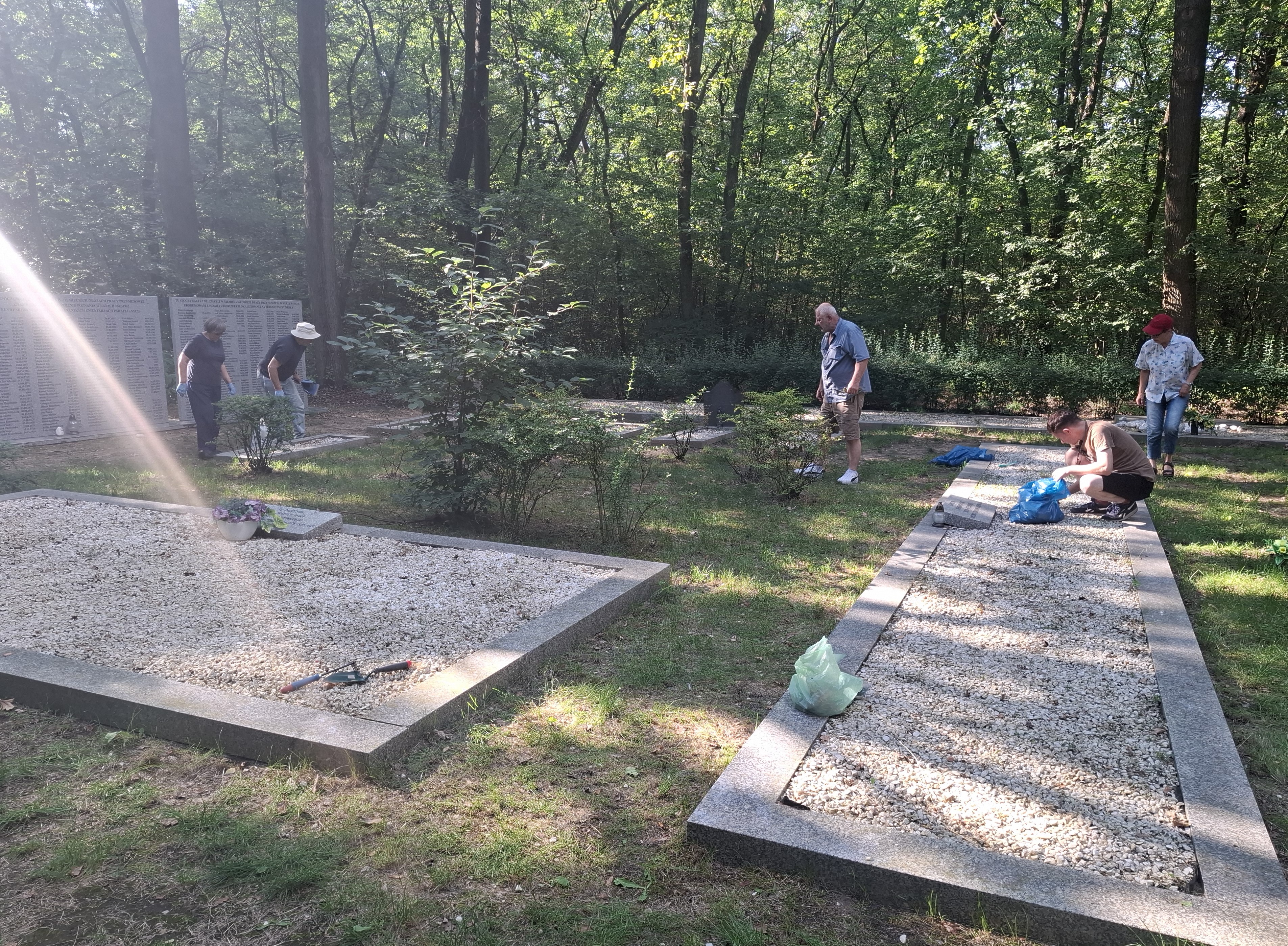 Jednym z misyjnych celów Stowarzyszenia Miasteczko Poznań jest pielęgnowanie pamięci o ofiarach Holokaustu. Dlatego opiekujemy się kwaterą żydowską na cmentarzu w Poznaniu (Cmentarz Komunalny nr 1, Miłostowo, wejście od ulicy Warszawskiej). W ostatnim tygodniu lipca spotkaliśmy się, by kwaterę posprzątać. Pielenie, wyrywanie chwastów, wyrzucanie sfatygowanych sztucznych kwiatów, połamanych gałęzi – to była nasza praca w niedzielne popołudnie. Zakończyliśmy ją zapisywaniem kamieni, zapaleniem zniczy na żydowskich nagrobkach i przed granitowymi tablicami postawionymi jesienią 2023 roku, zawierającymi imiona i nazwiska Żydów więzionych i zamordowanych w obozie w Nekli, a których szczątki tutaj pochowano. Pamiętamy! Zachor!